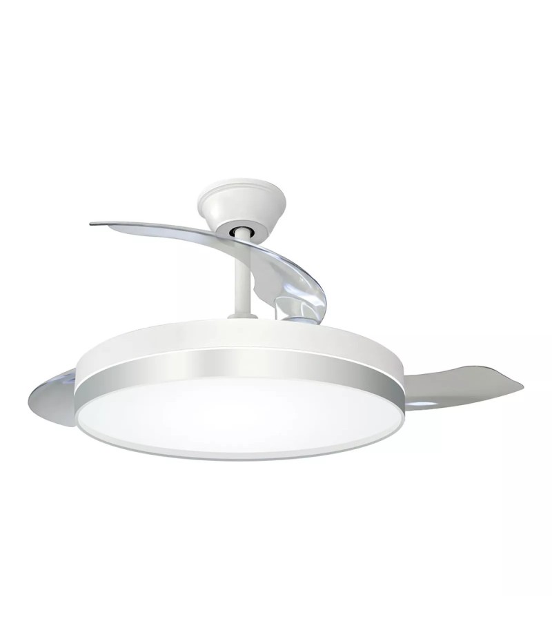 VENTILADOR DE TECHO, PLATEADO, 3CCT, SILENCIOSO, CON 3 ASPAS TRANSPARENTES RETRÁCTILES. MOTOR DC, 36 W. TIPO DE LUZ: LUZ CÁLIDA 3000 K, LUZ DÍA 4000 K, LUZ FRÍA 6500 K, 4100 lm, 6 VELOCIDADES, <30 dB, FUNCIÓN INVERSA, FUNCIÓN VERANO LAS ASPAS GIRAN EN SENTIDO CONTRARIO A LAS AGUJAS DEL RELOJ Y FUNCIÓN INVIERNO GIRAN EN EL SENTIDO DE LAS AGUJAS DEL RELOJ, CUERPO DE HIERRO, CUBIERTA DE ACRÍLICO, ASPAS DE PLÁSTICO, INCLUYE MANDO A DISTANCIA, FLUJO DE AIRE MÁXIMO 6141 m³/h, TENSIÓN 220-240 V~50Hz. DIMENSIONES, CON ASPAS ABIERTAS 107 x 31 cm, CON ASPAS CERRADAS 48,7 x 31 cm